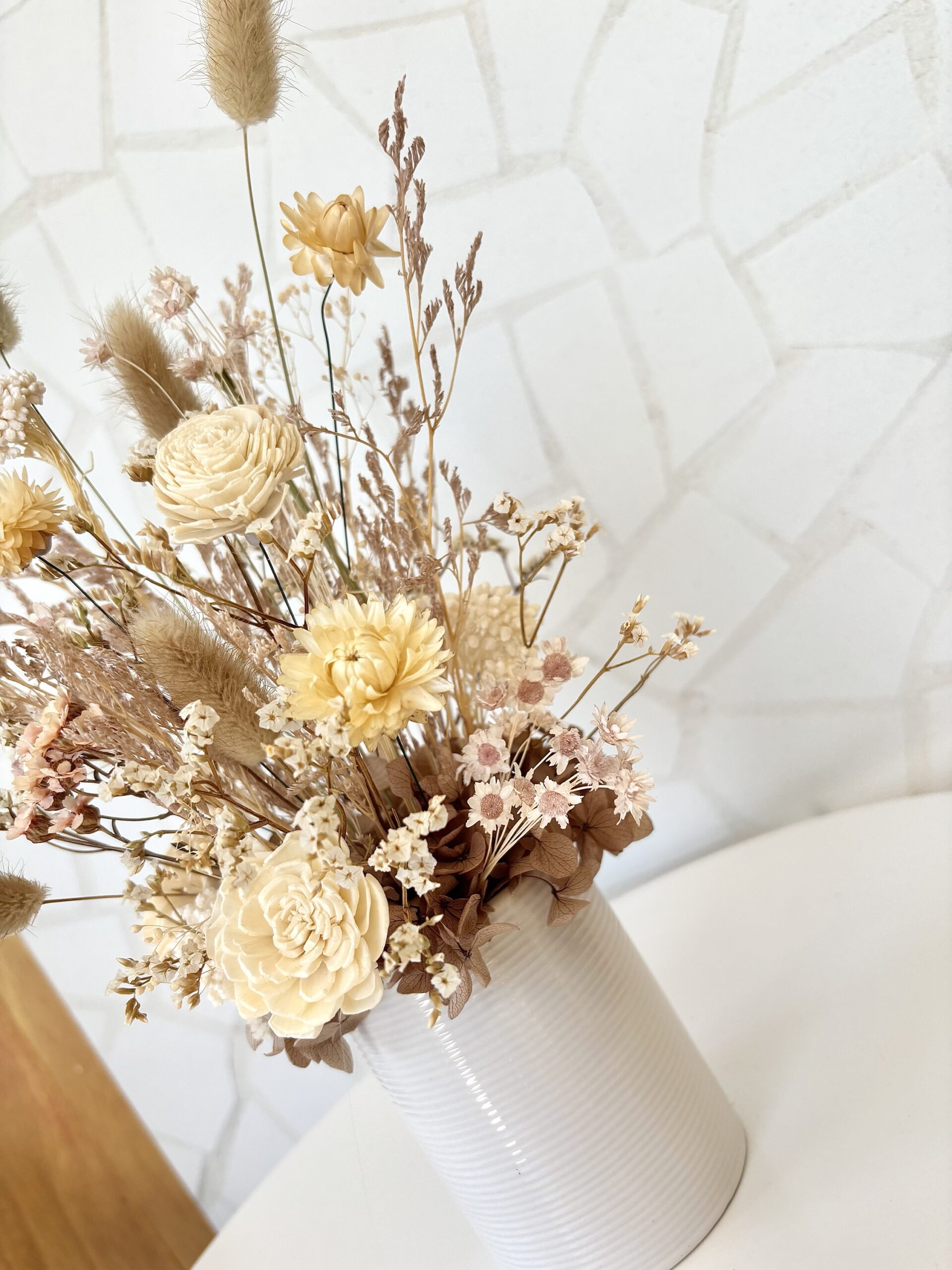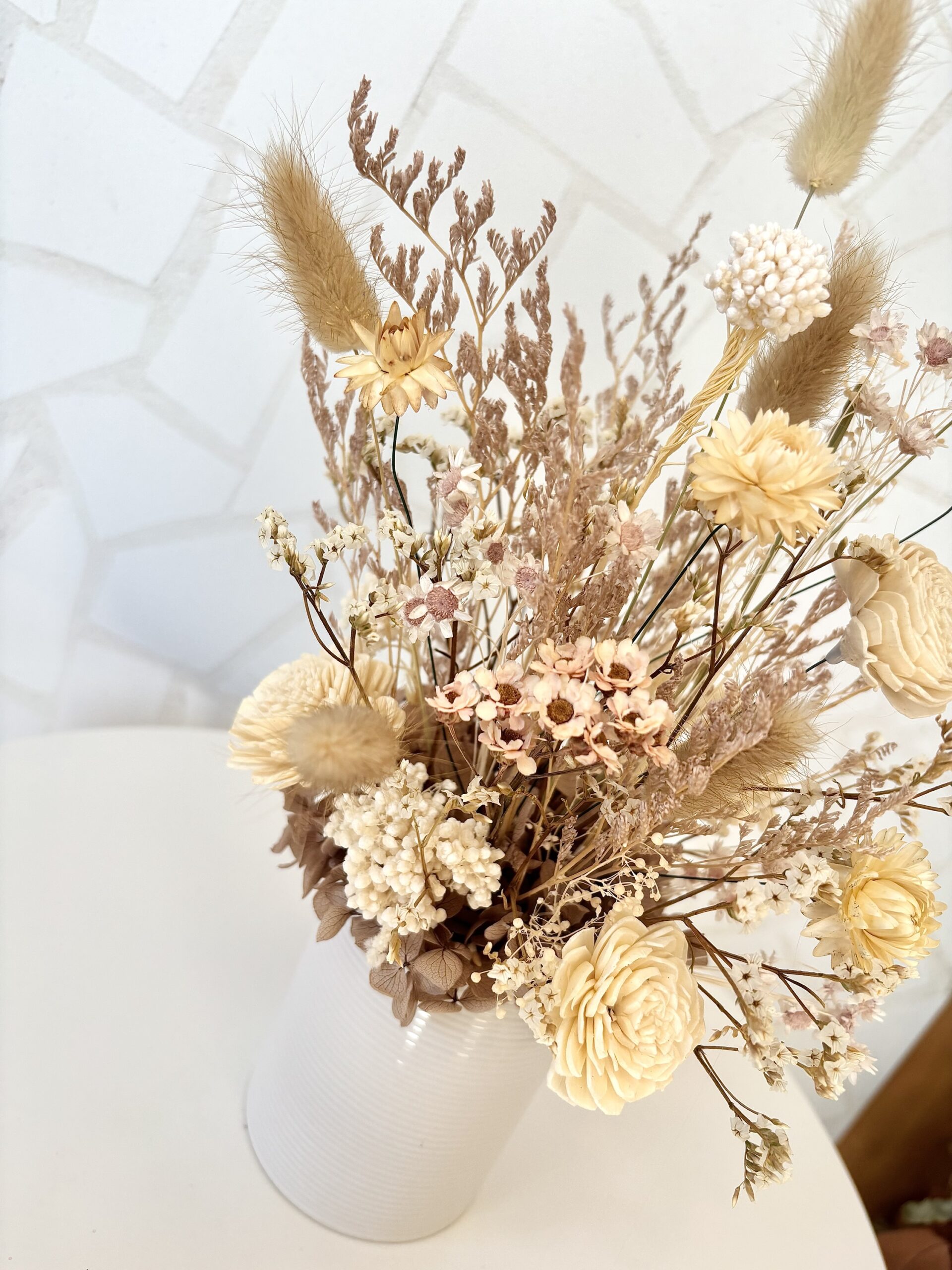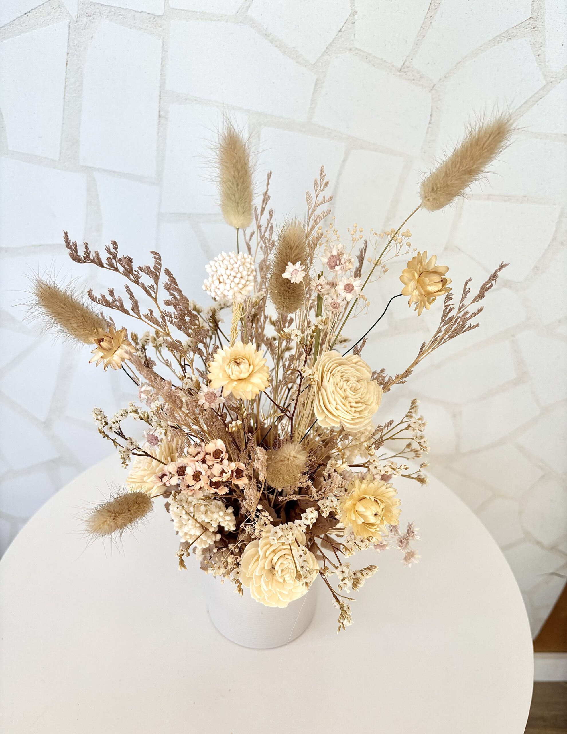 Amelia is a sweet arrangement in neutrals, lemons and blush pinks, in a white ceramic pot