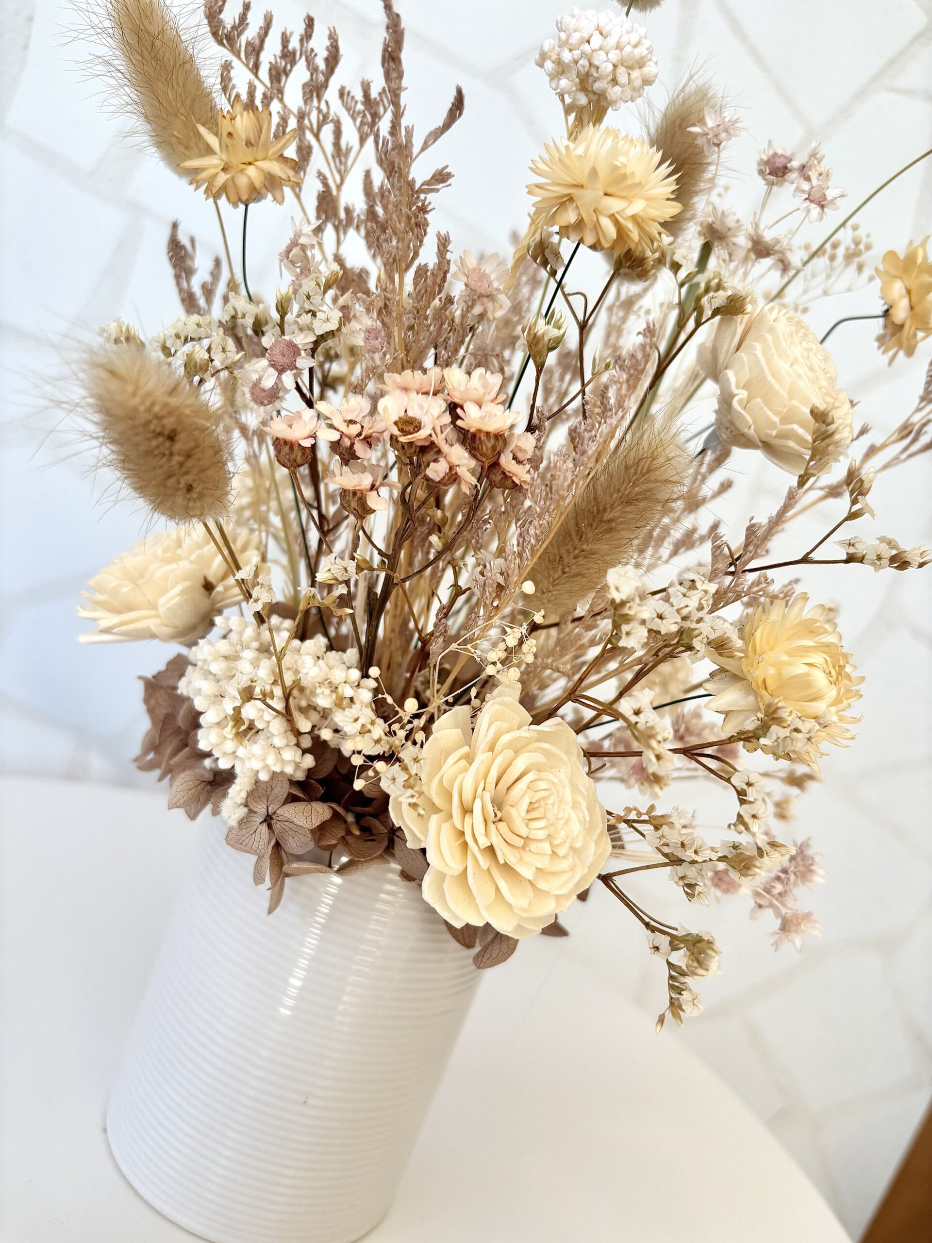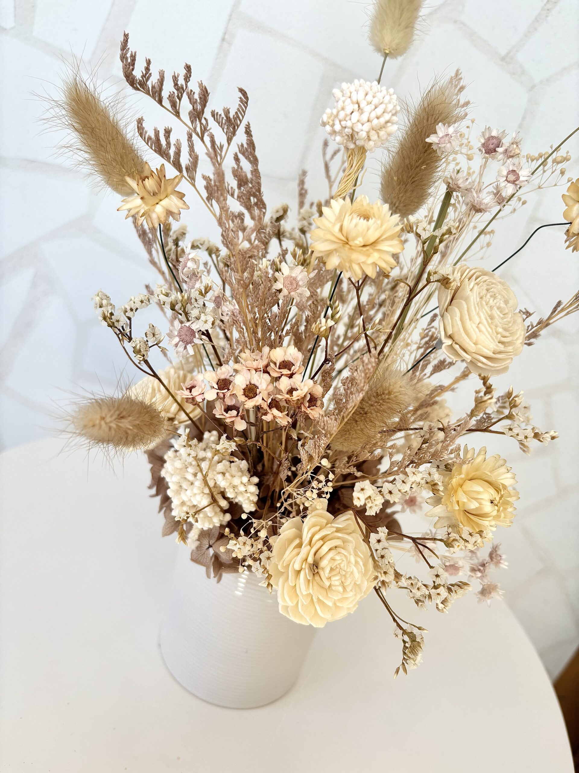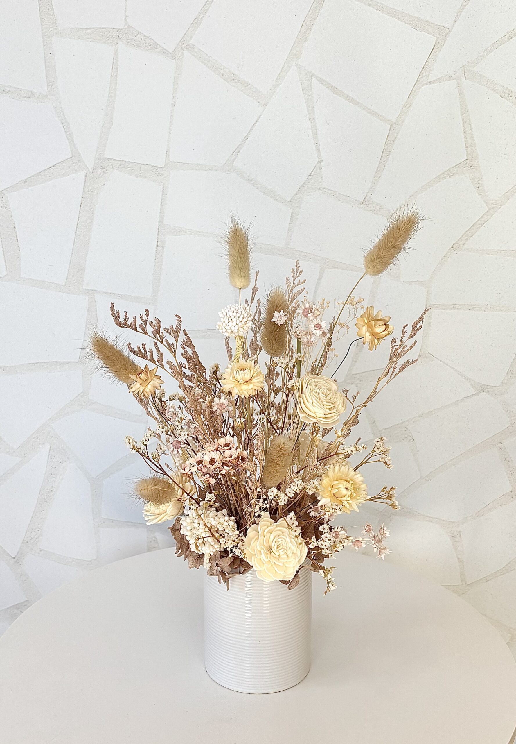 Amelia is a sweet arrangement in neutrals, lemons and blush pinks, in a white ceramic pot