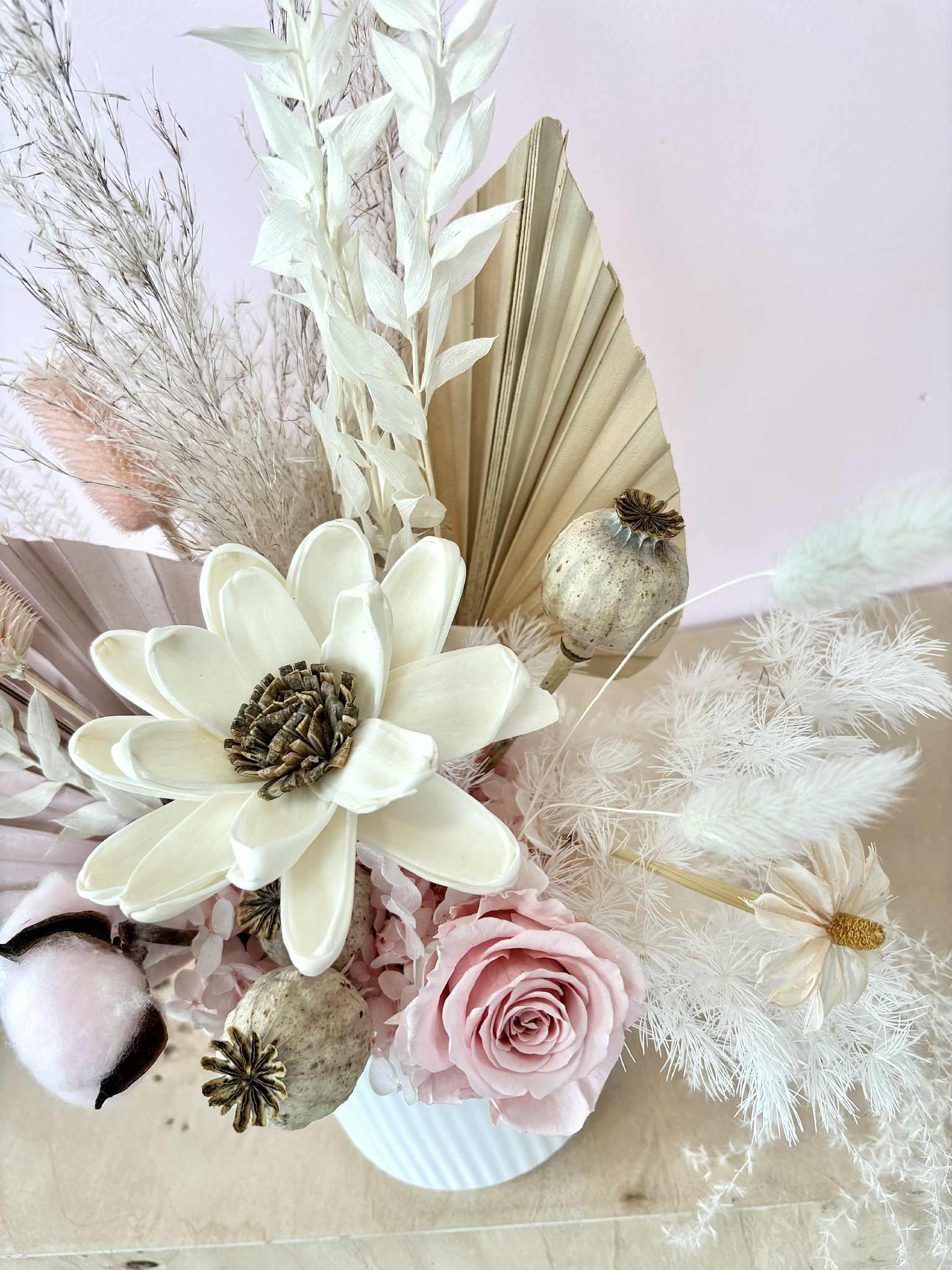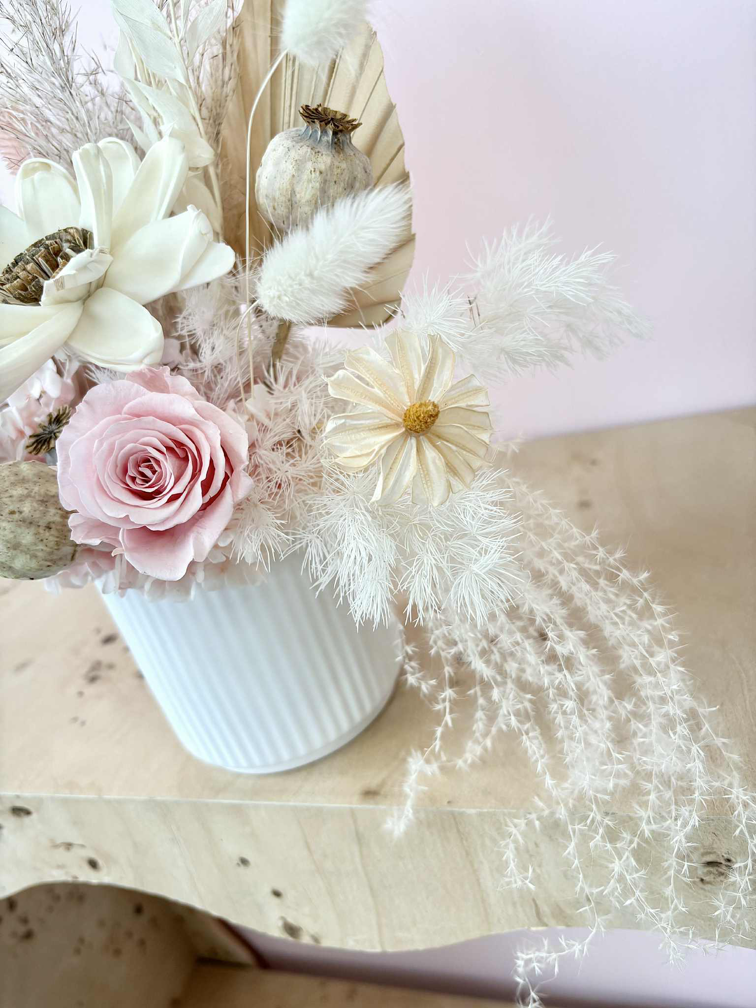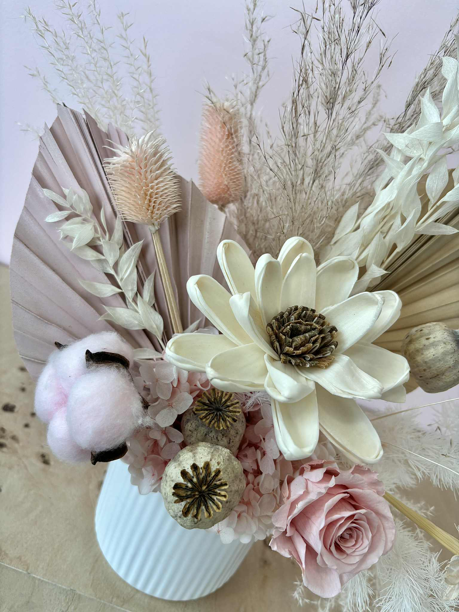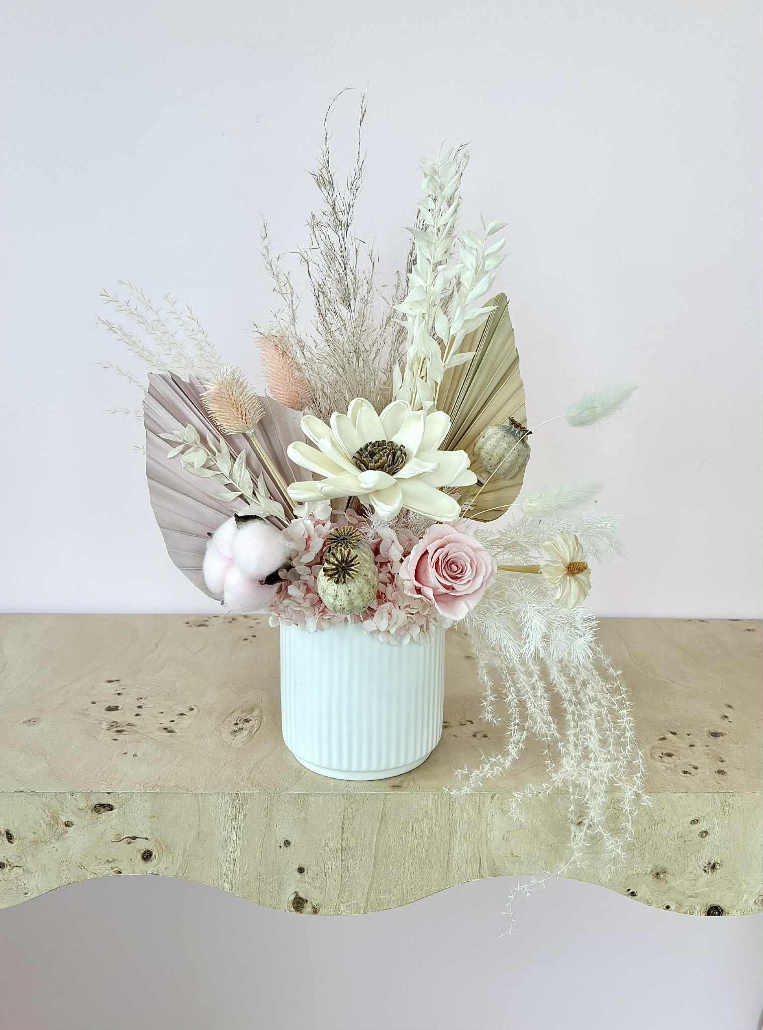 Cassie is a lovely soft pinks, whites and naturals arrangement in a white ceramic pot.