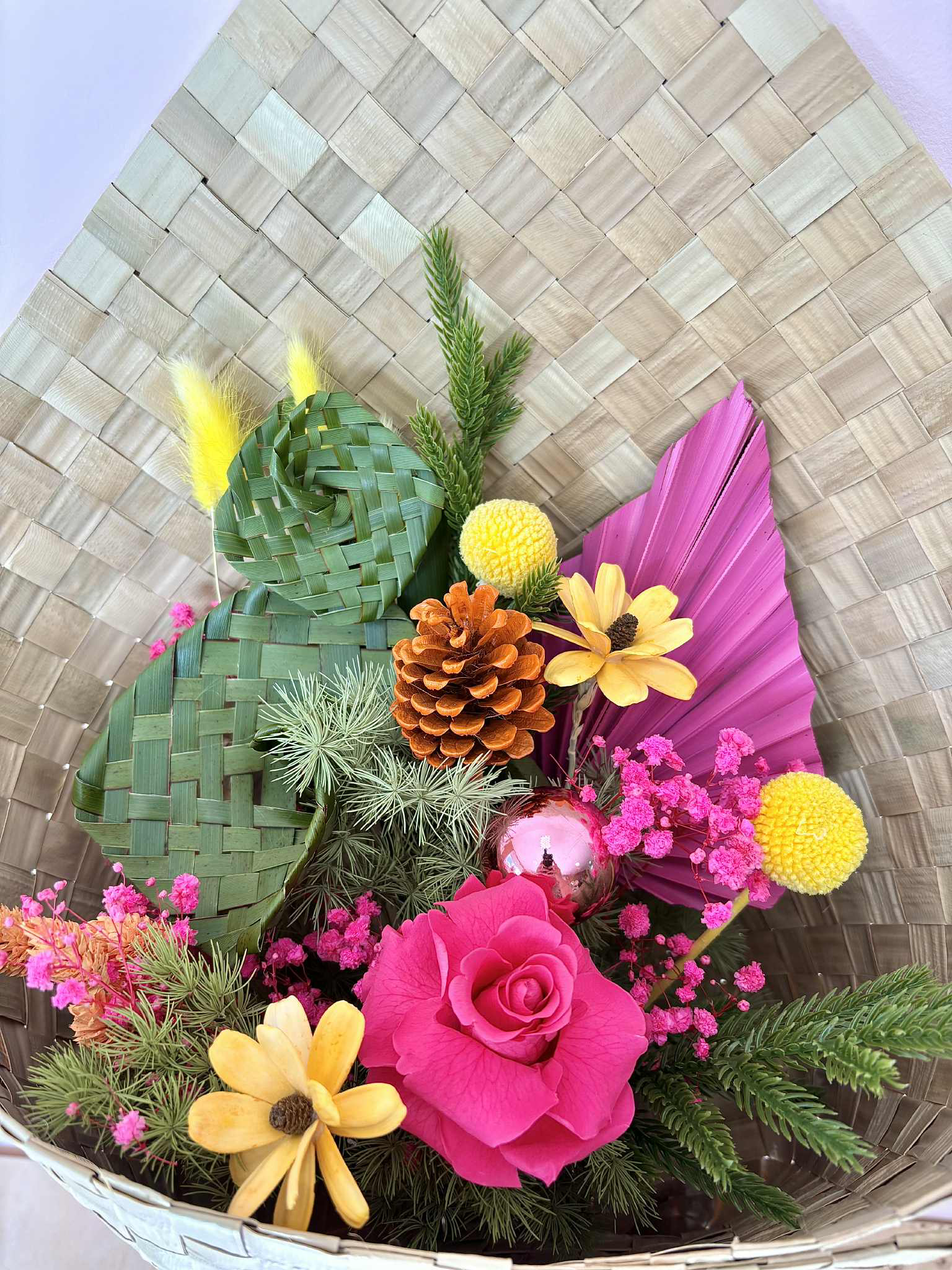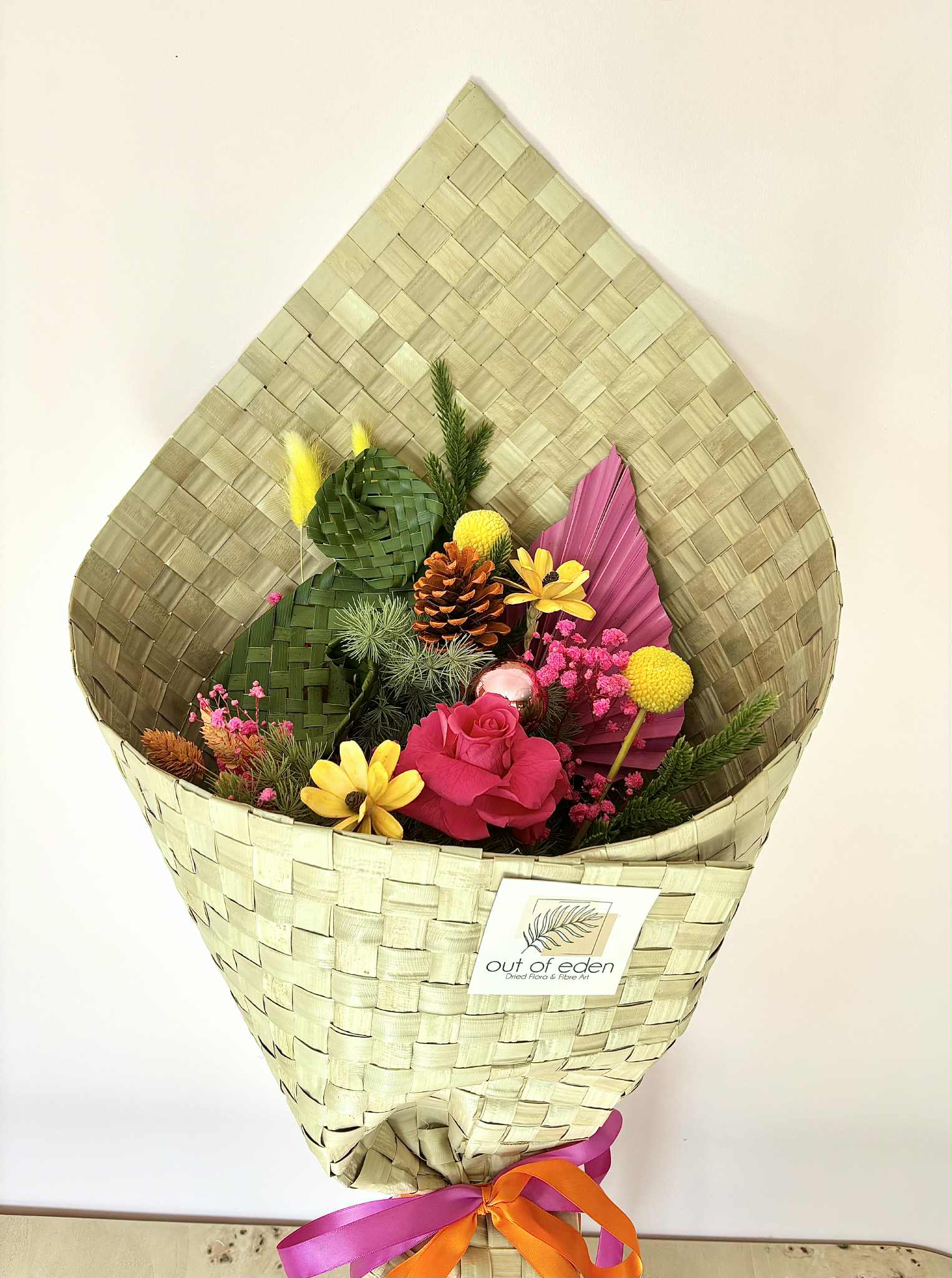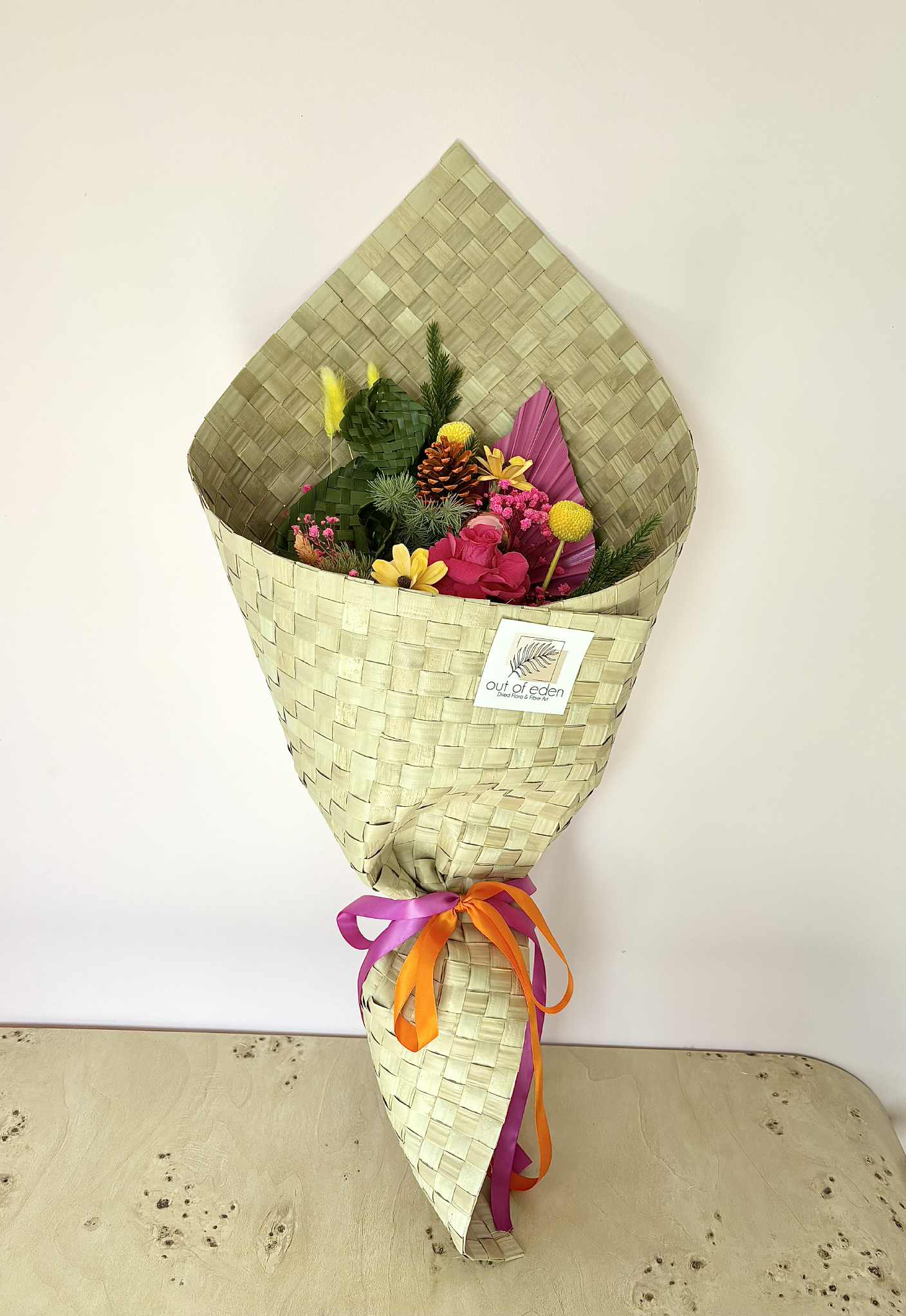 Christmassy Harakeke Wrap bouquet – Brights is a lovely mix of vibrant colours with festive touches. A great gift for this Christmas season!