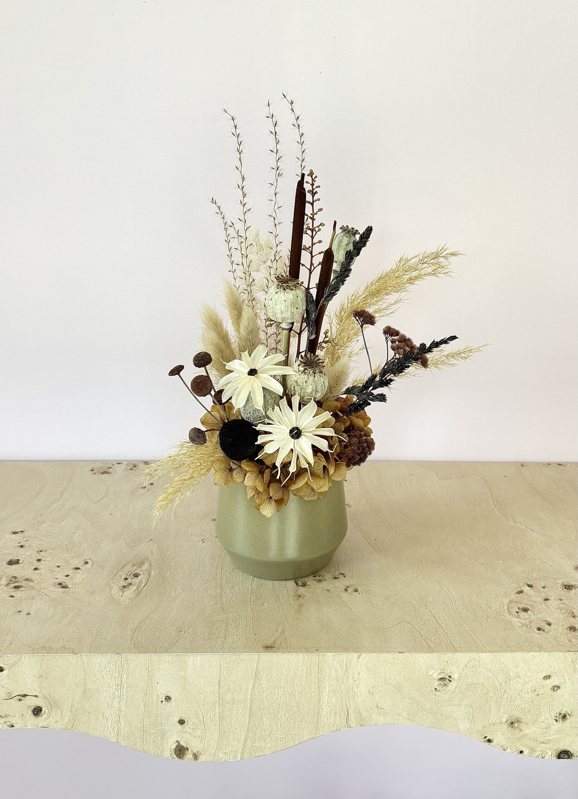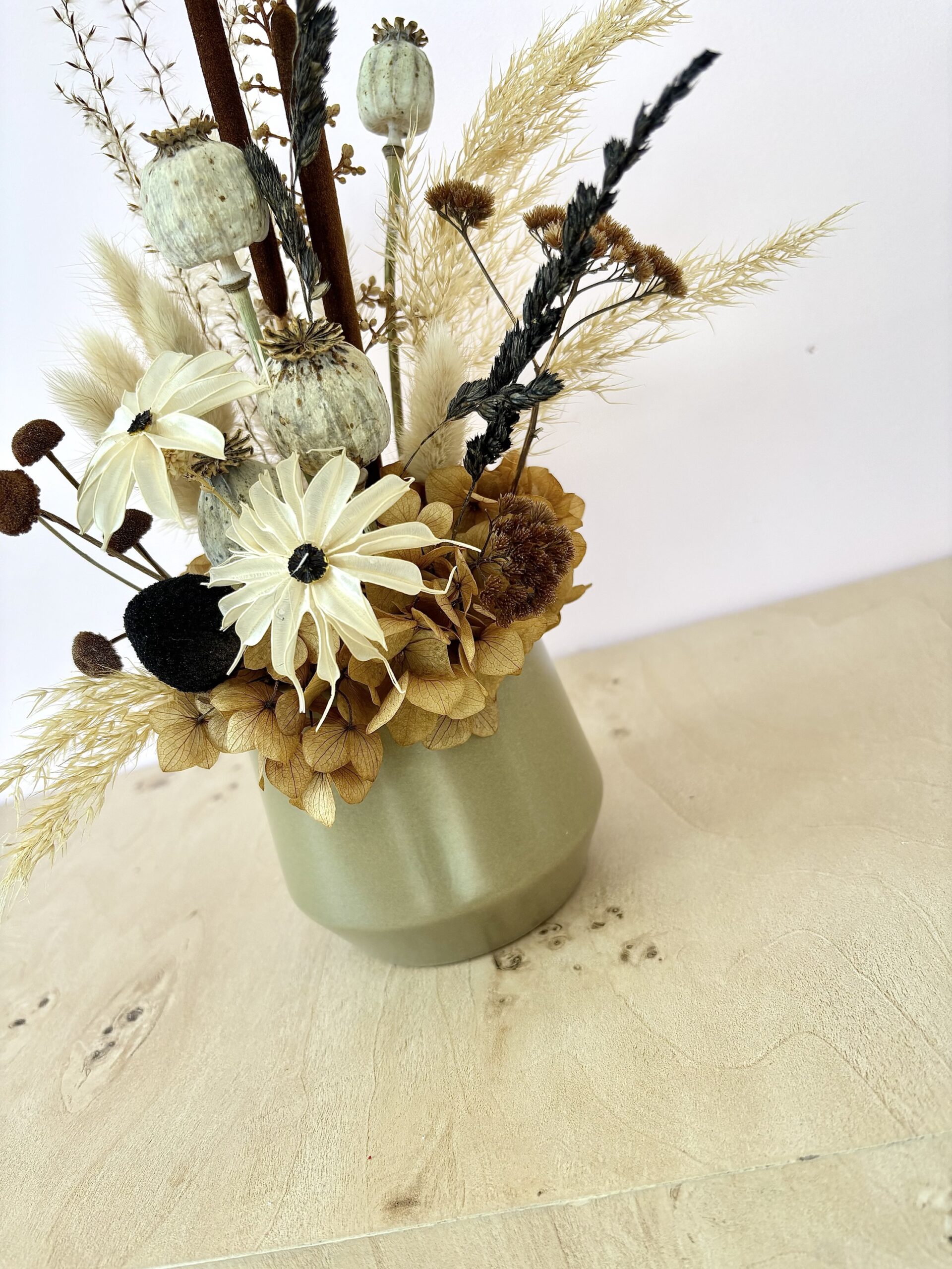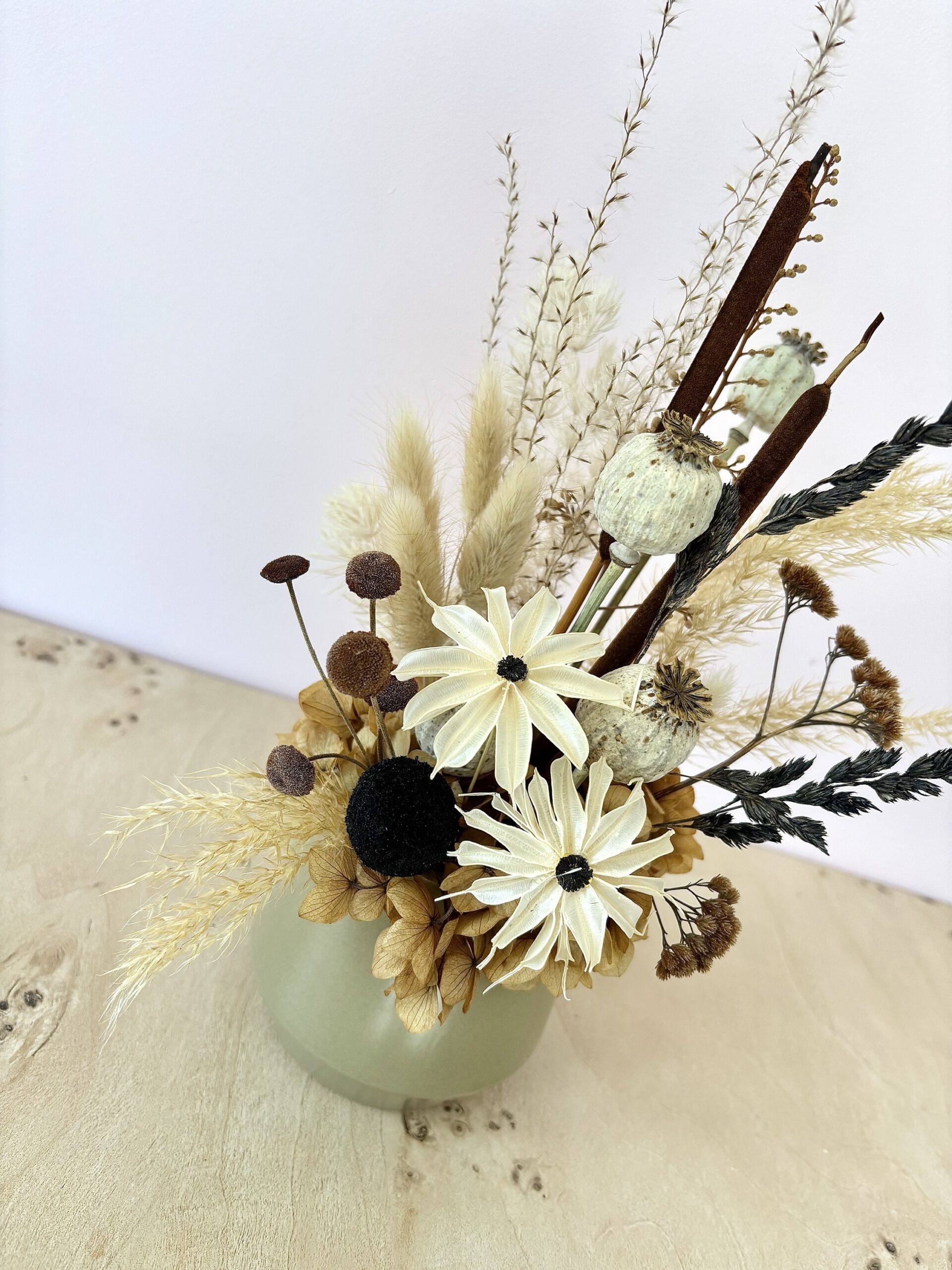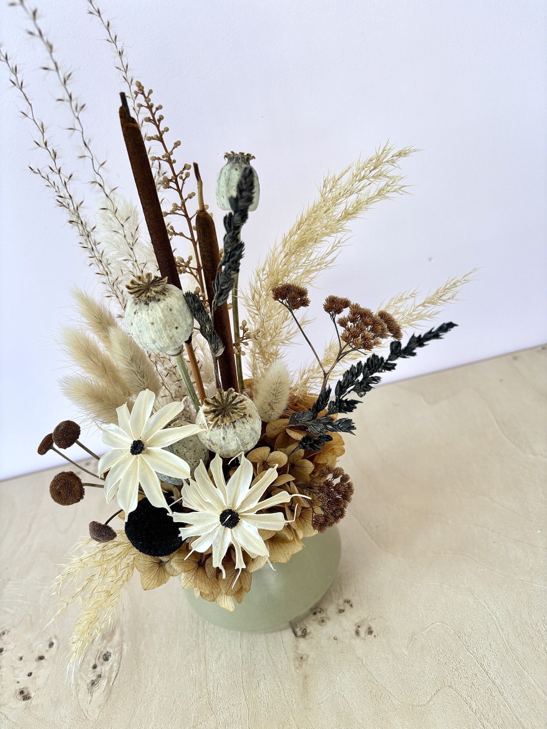 Evelyn is a neutral arrangement with touches of black, in a fawn brown pot.