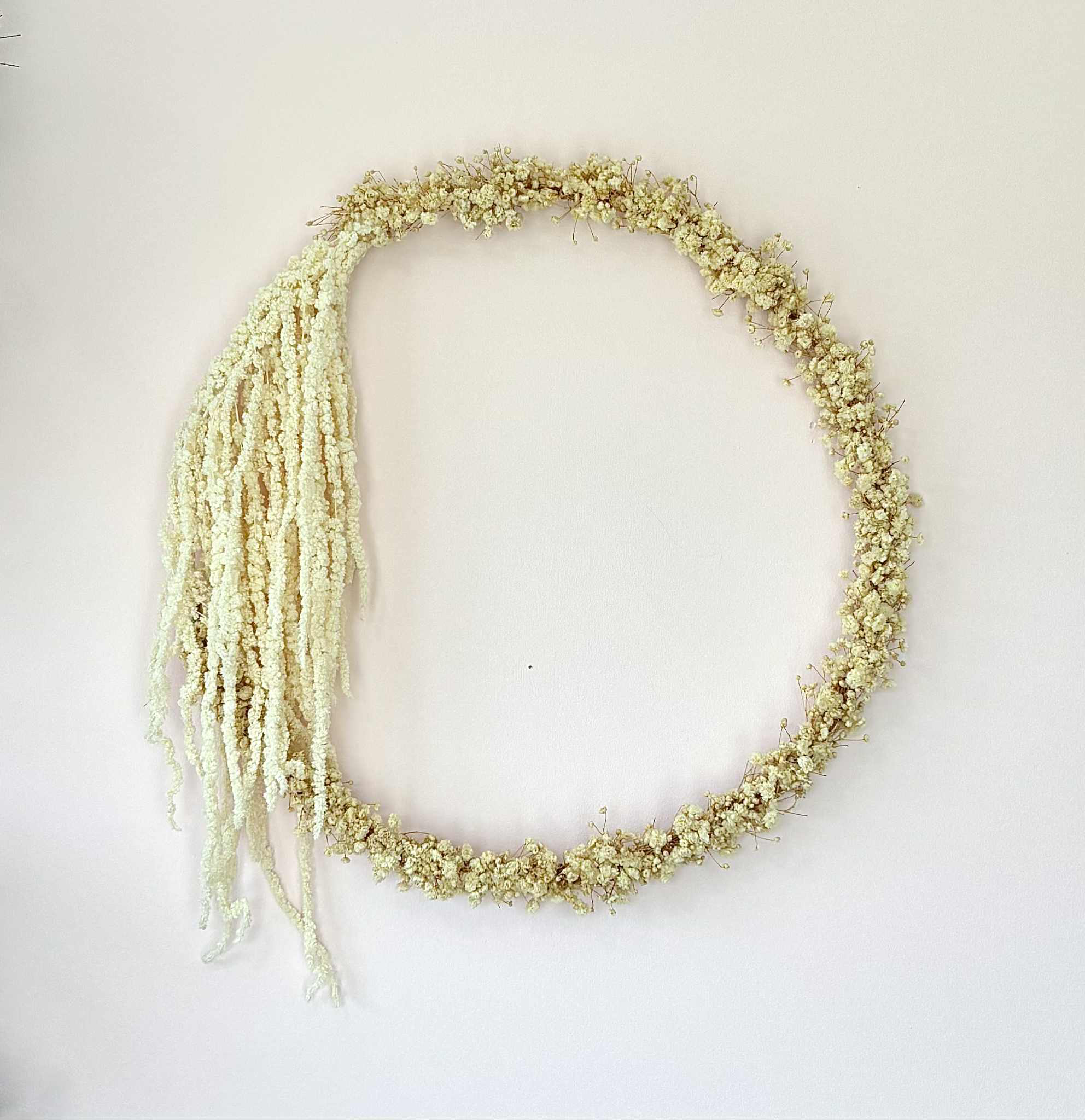 Such a beautiful statement piece in soft fluffy cream gypsophila and hanging Amaranthus!