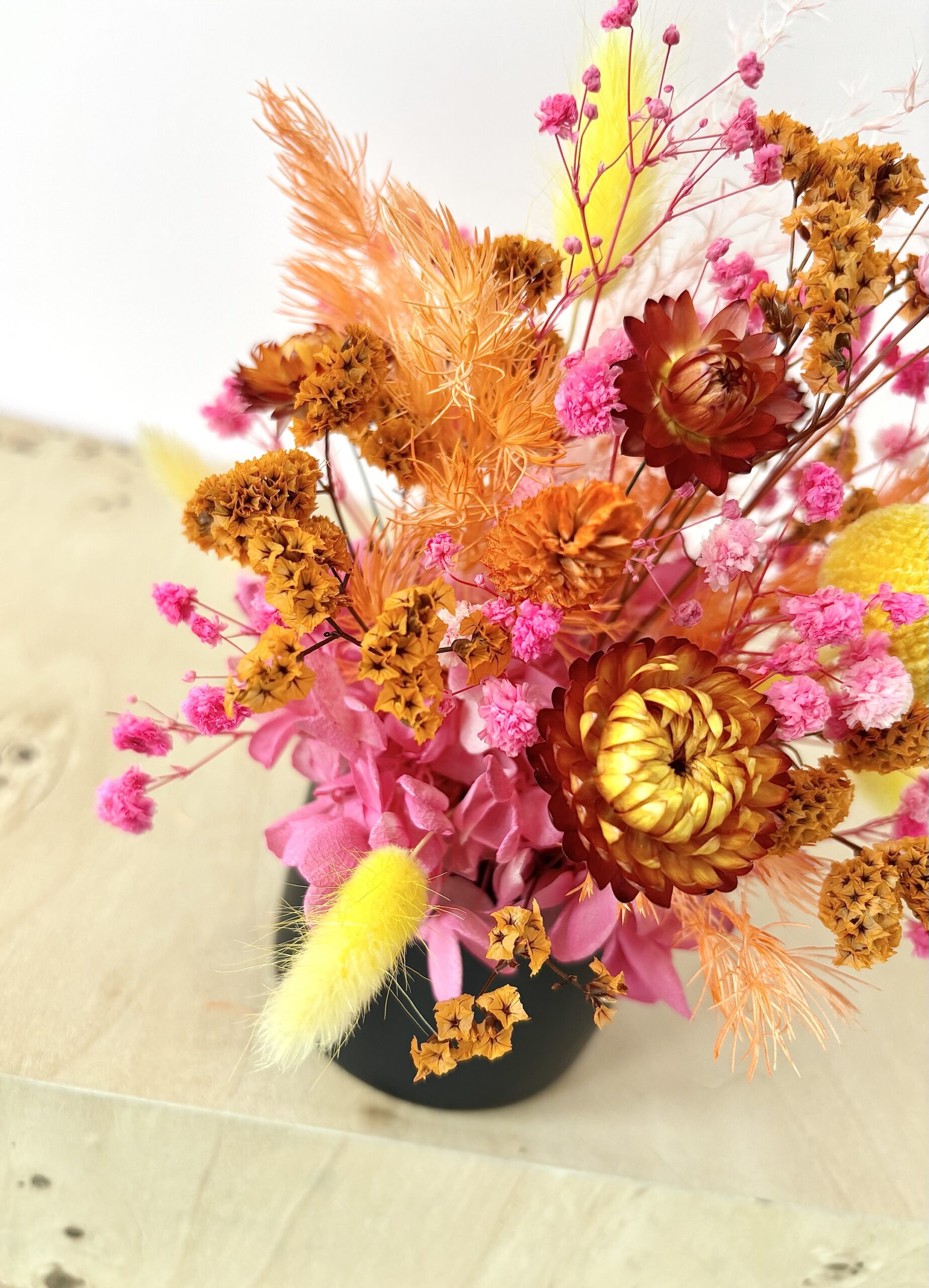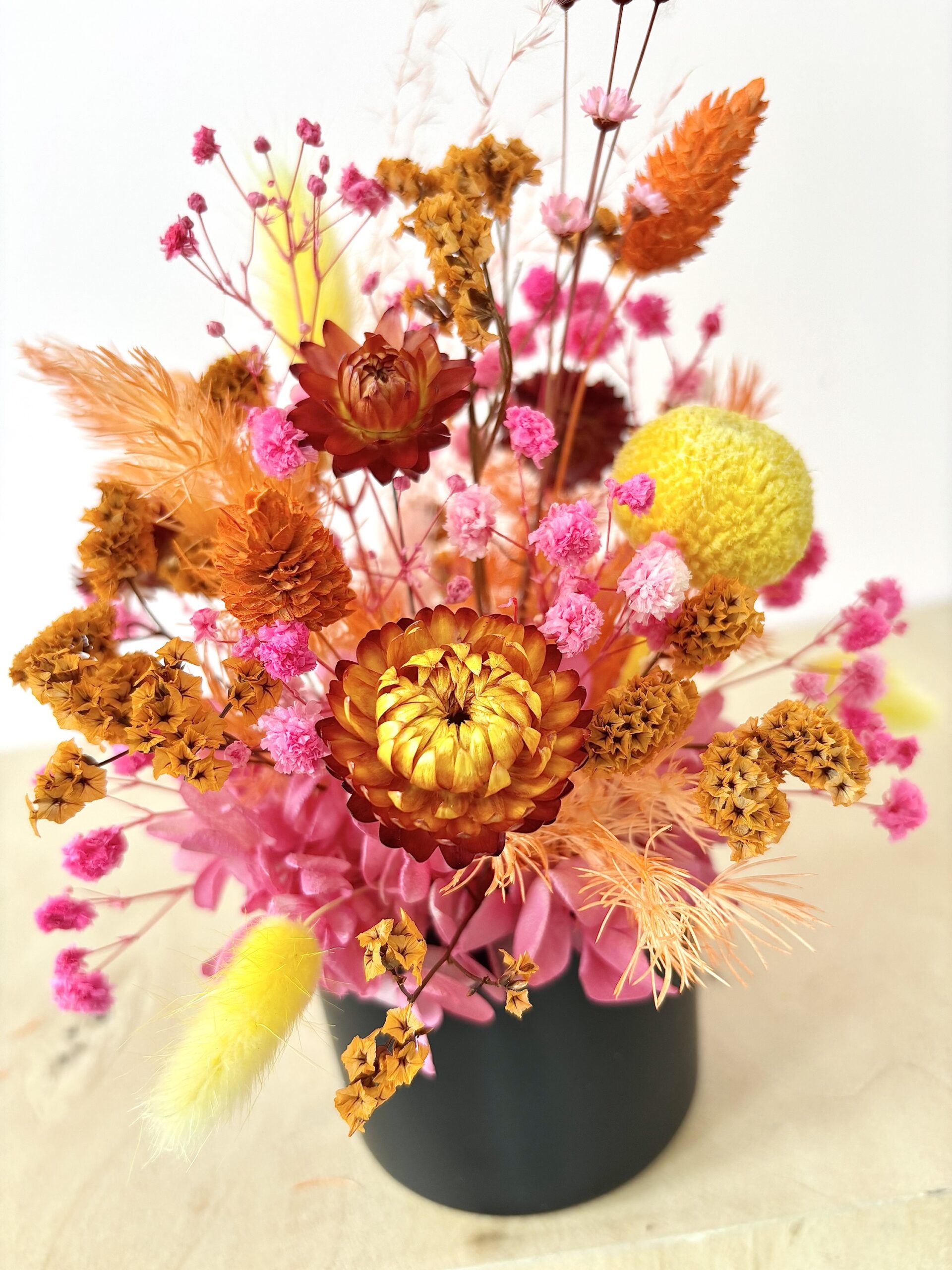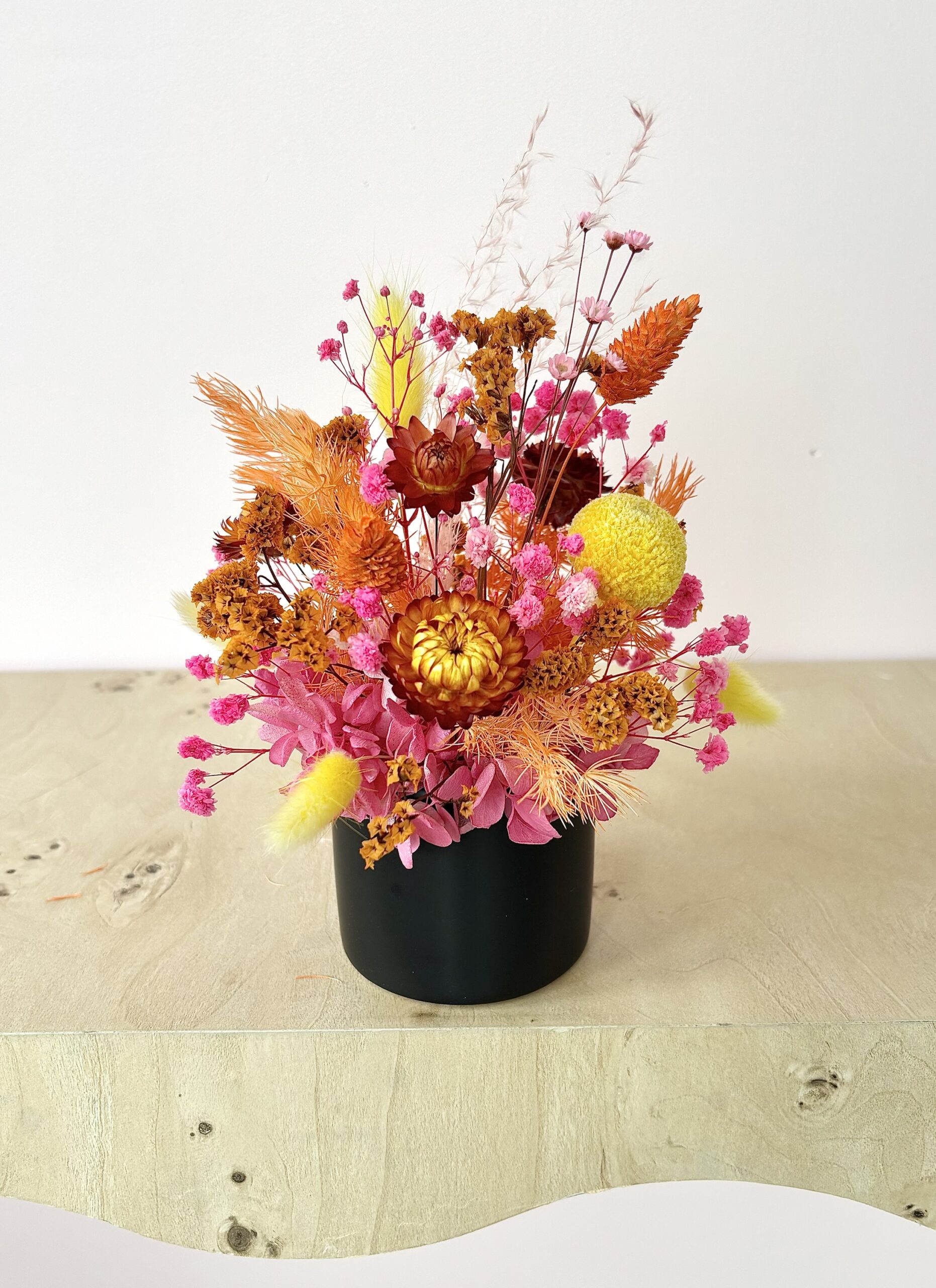 Jessi is a fun bright lil mix in hot pinks, oranges and yellows, in our mini black ceramic pot. A great little size for gifting, or popping in the perfect lil spot at home.