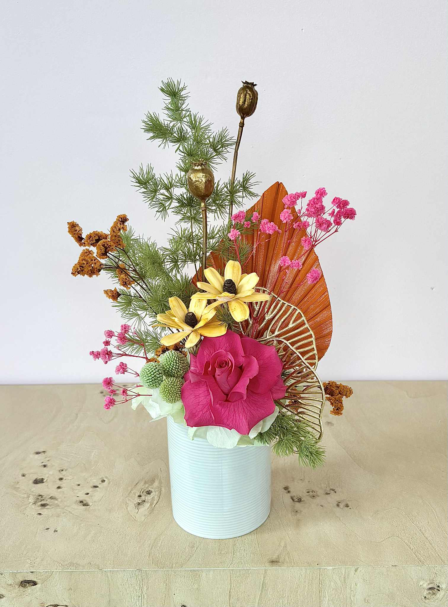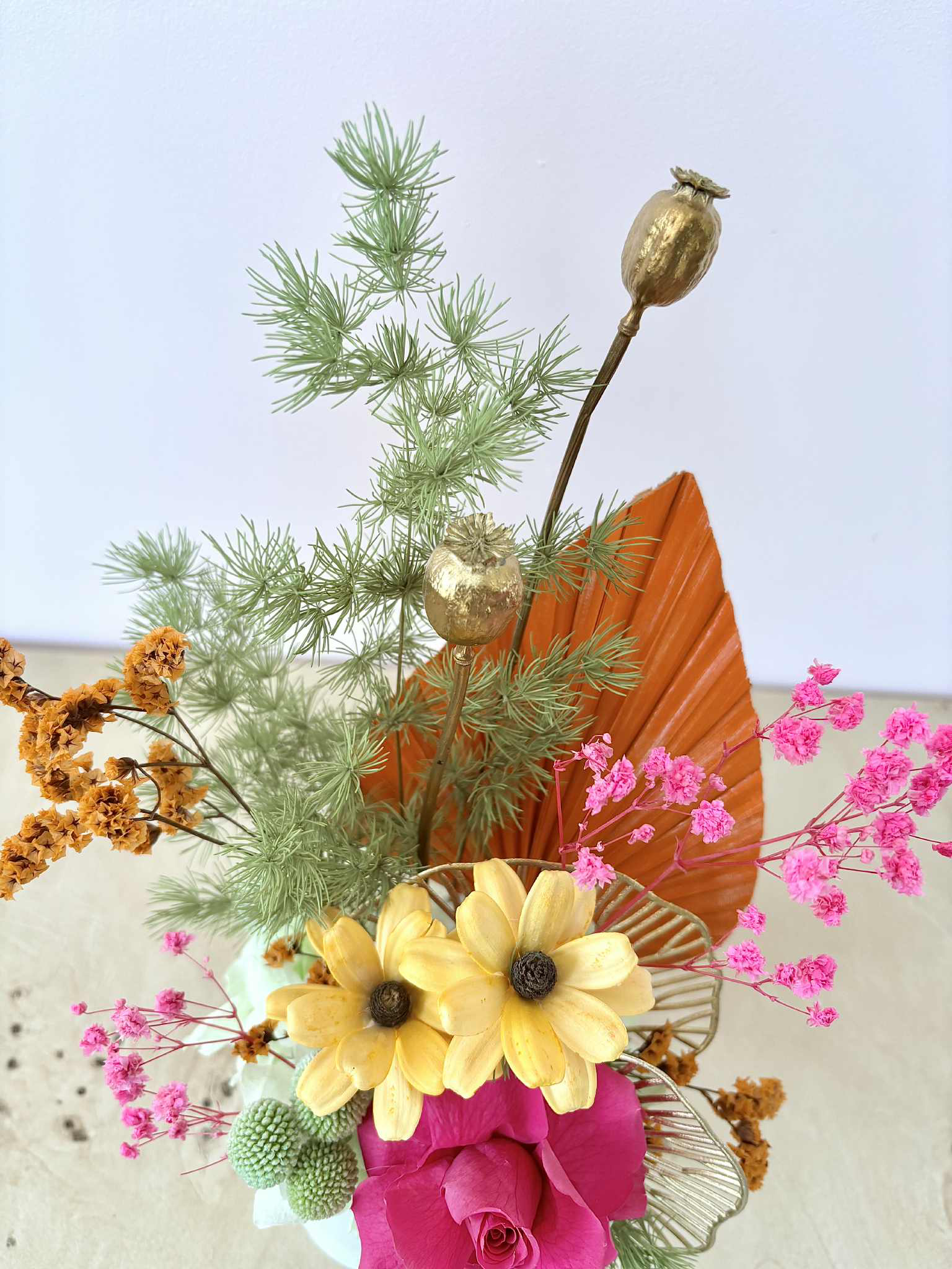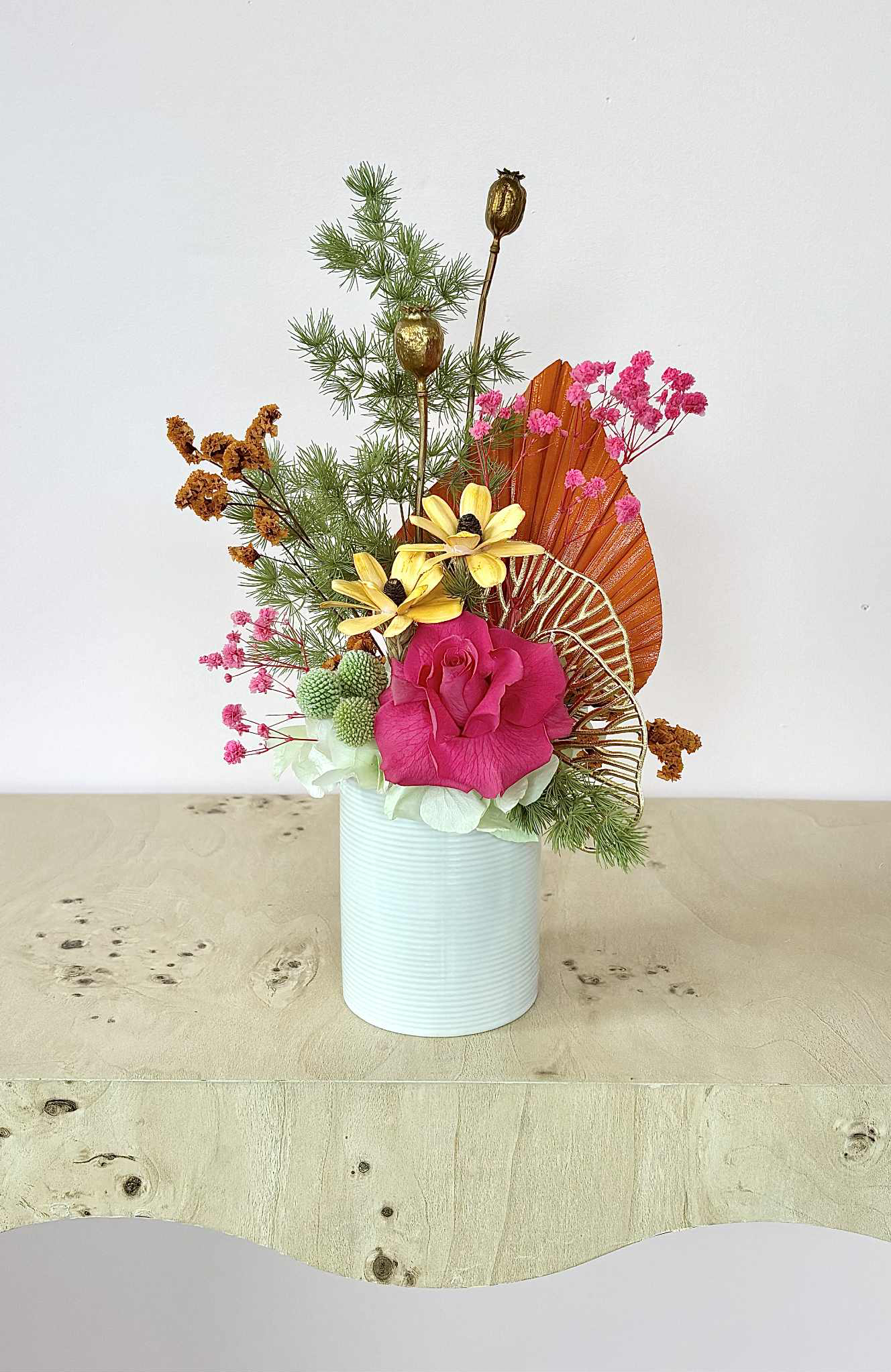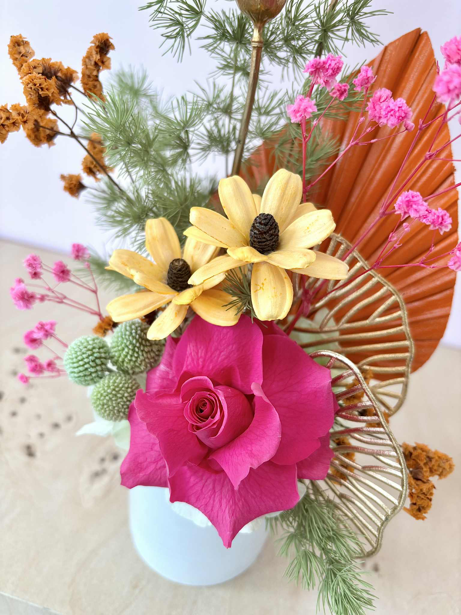 Leilani is a tropical mix of bright pinks, oranges and limes, with a touch of gold, in a white ceramic pot.