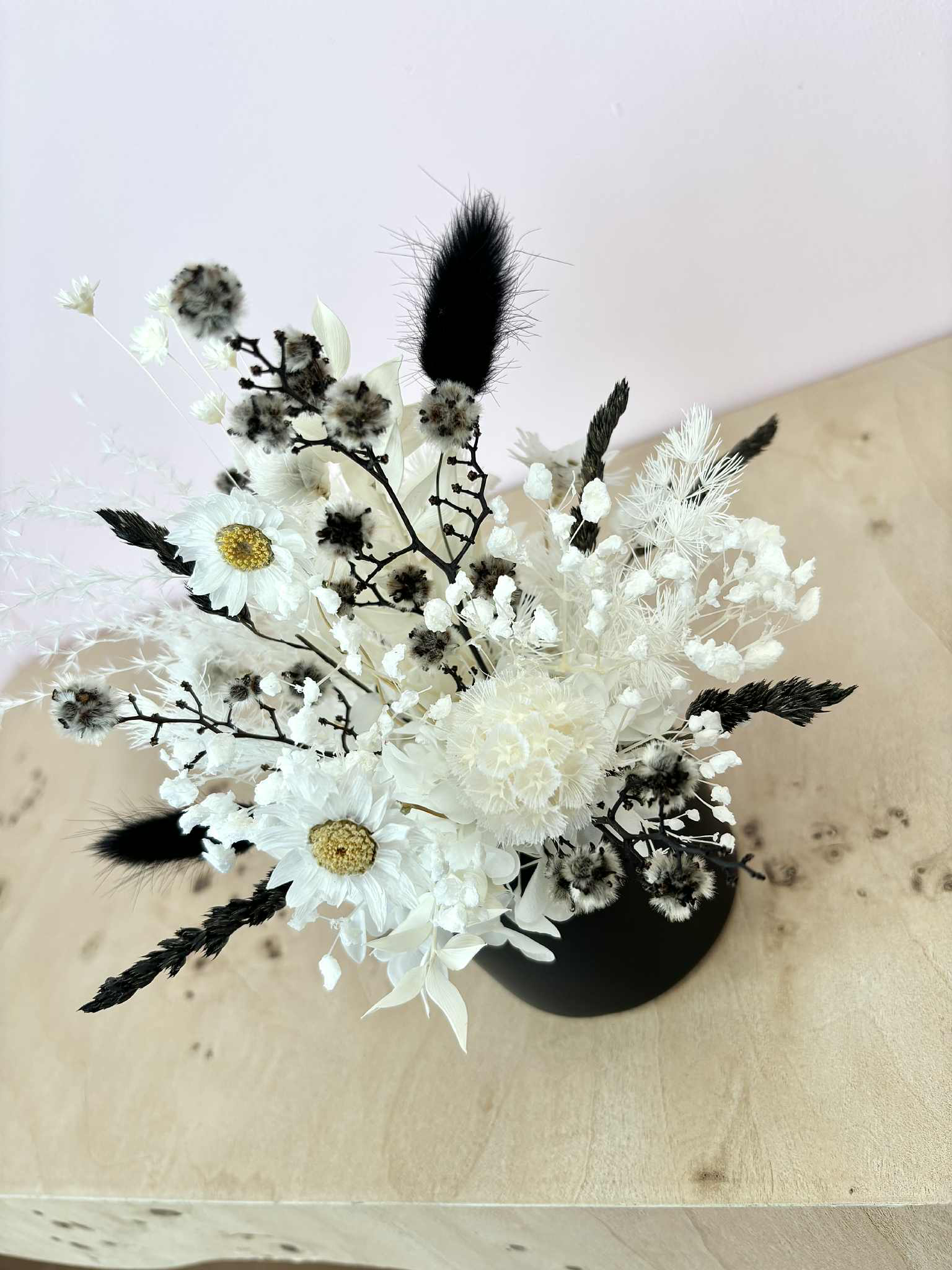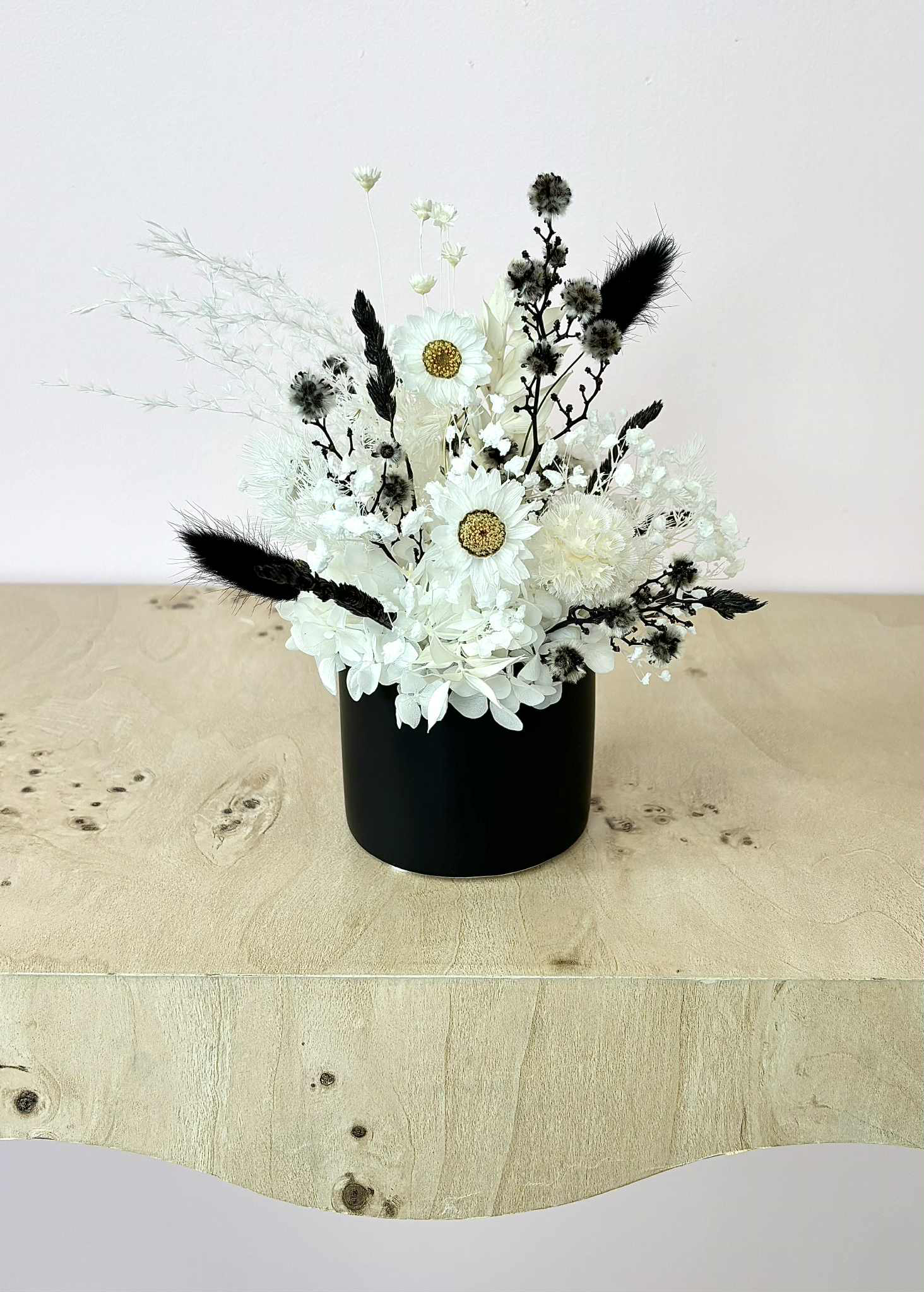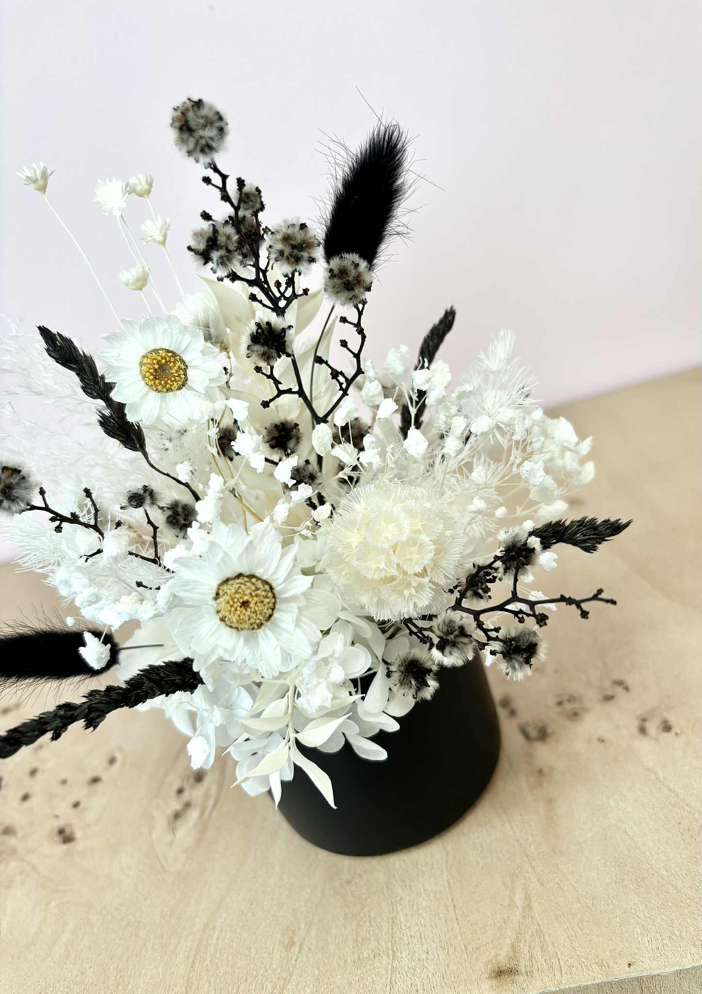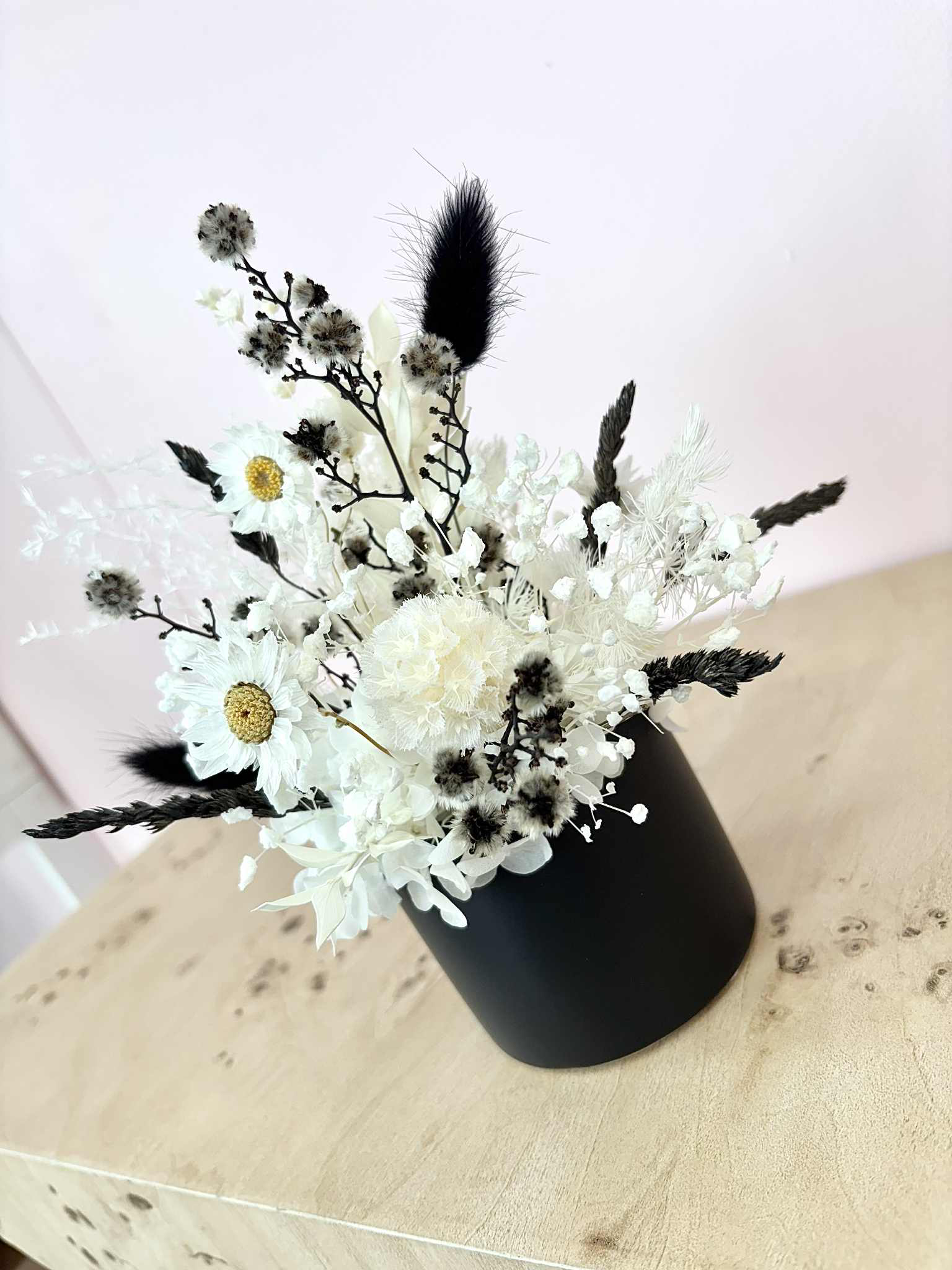 Molly is a cute white and black arrangement in our mini black ceramic pot. A great little size for gifting, or popping in the perfect lil spot at home.