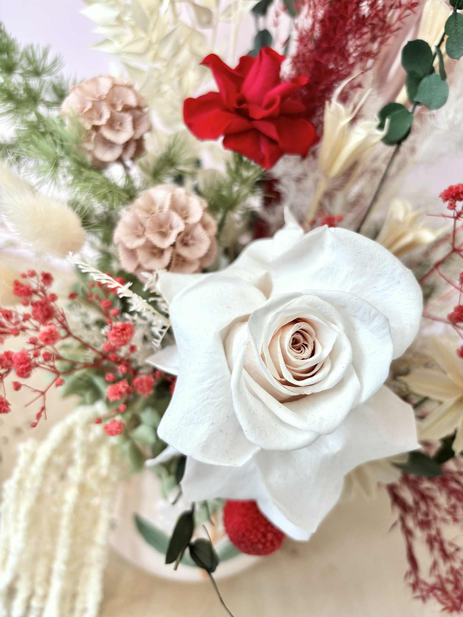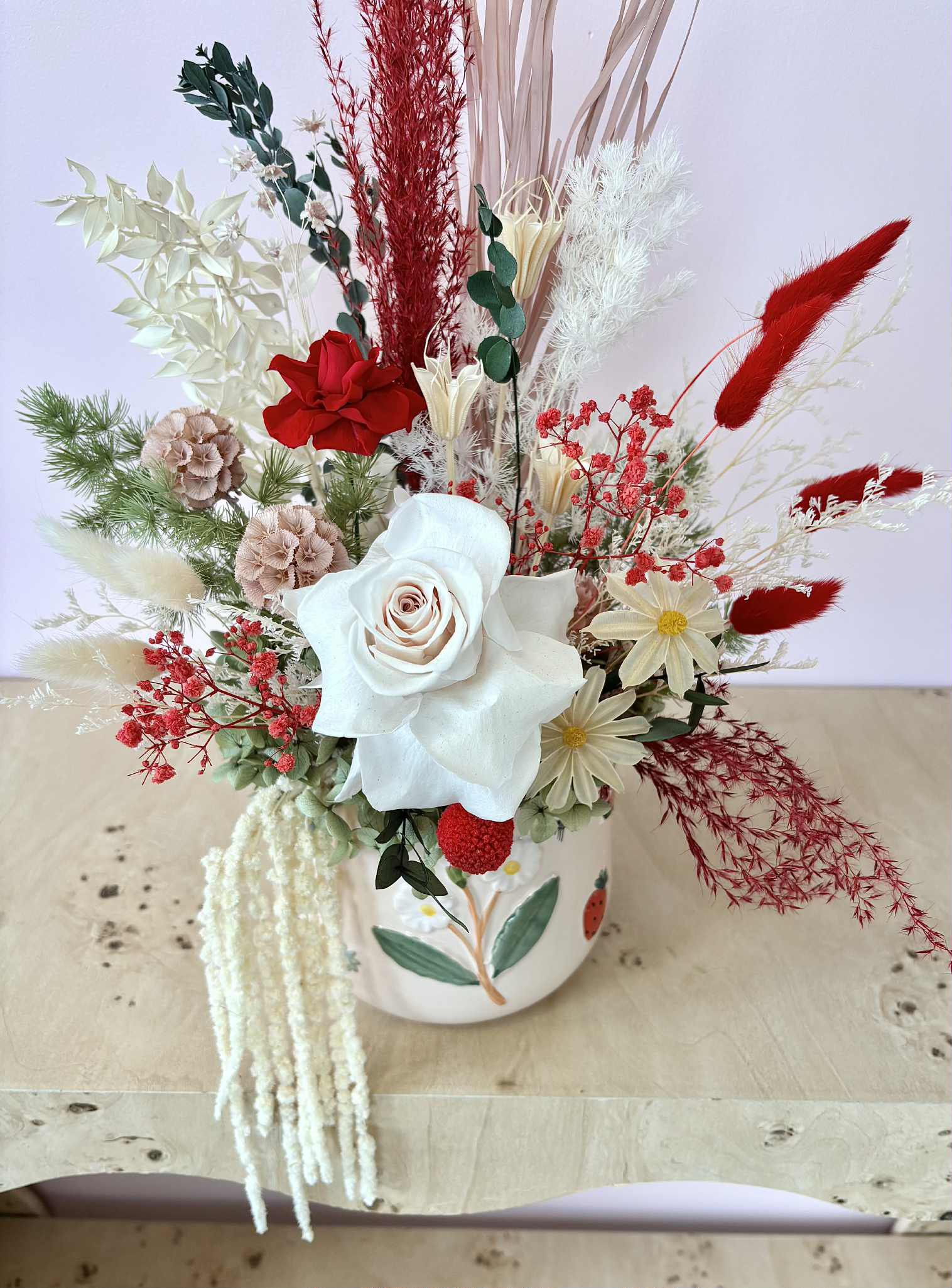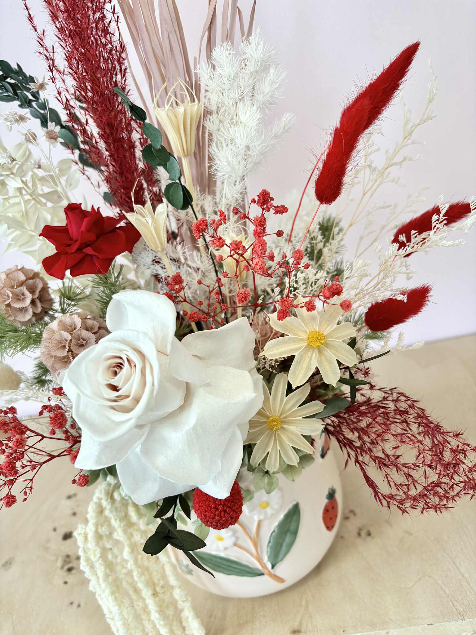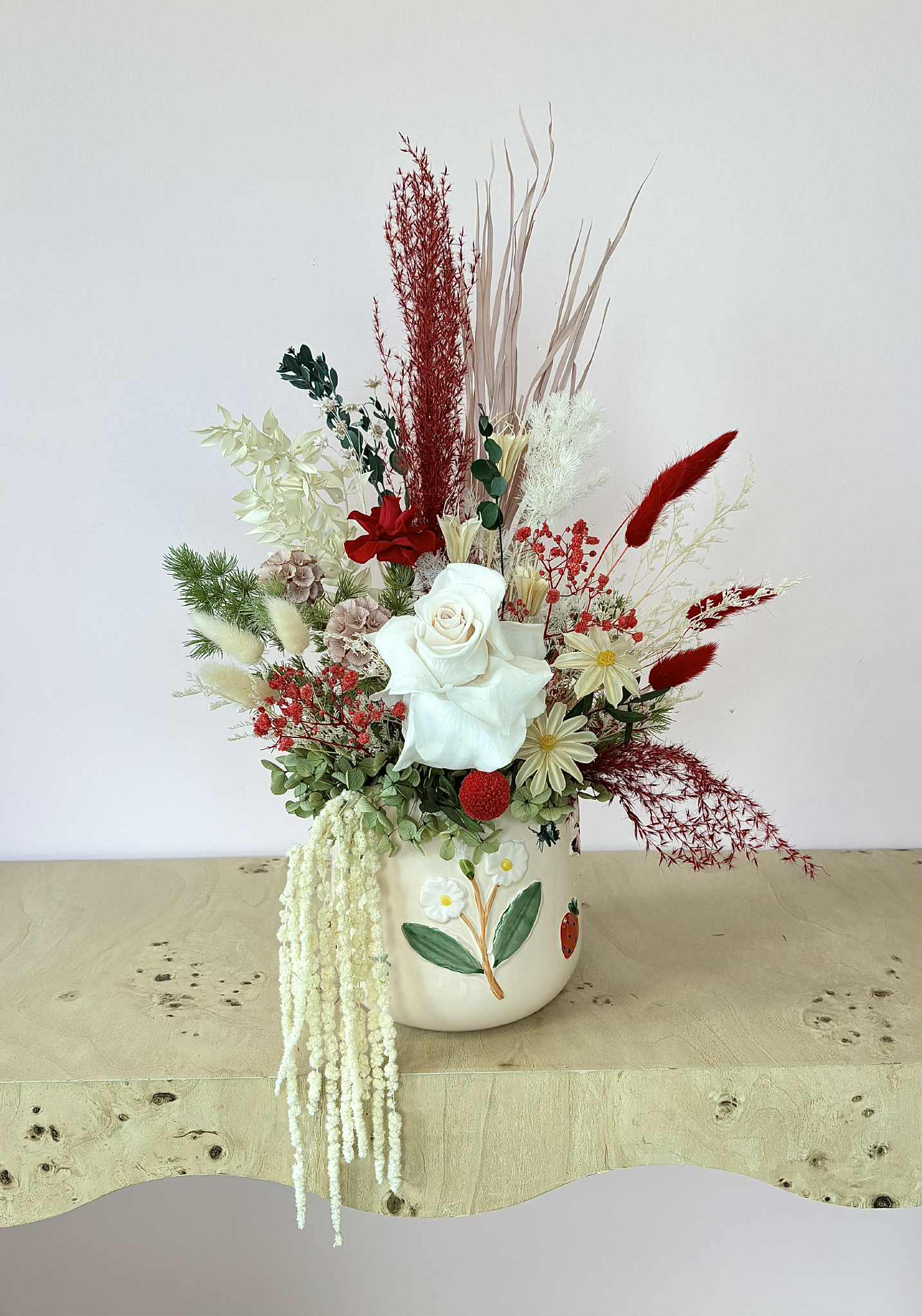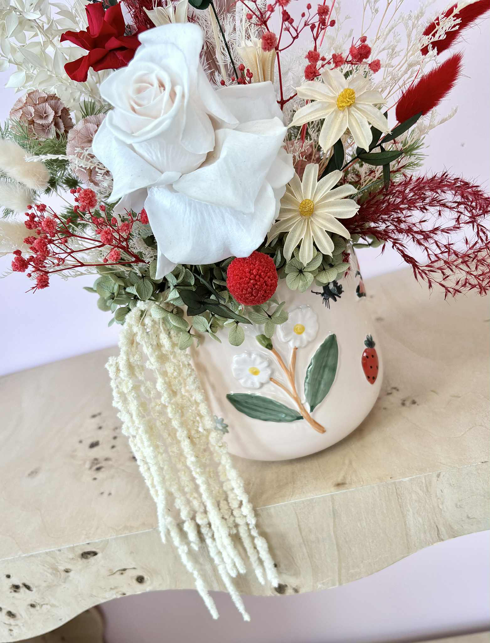 Strawberry Shortcake is an absolutely gorgeous arrangement in blush pinks, reds, greens and whites, in the sweetest pot! Such a beautiful piece for your home or business.